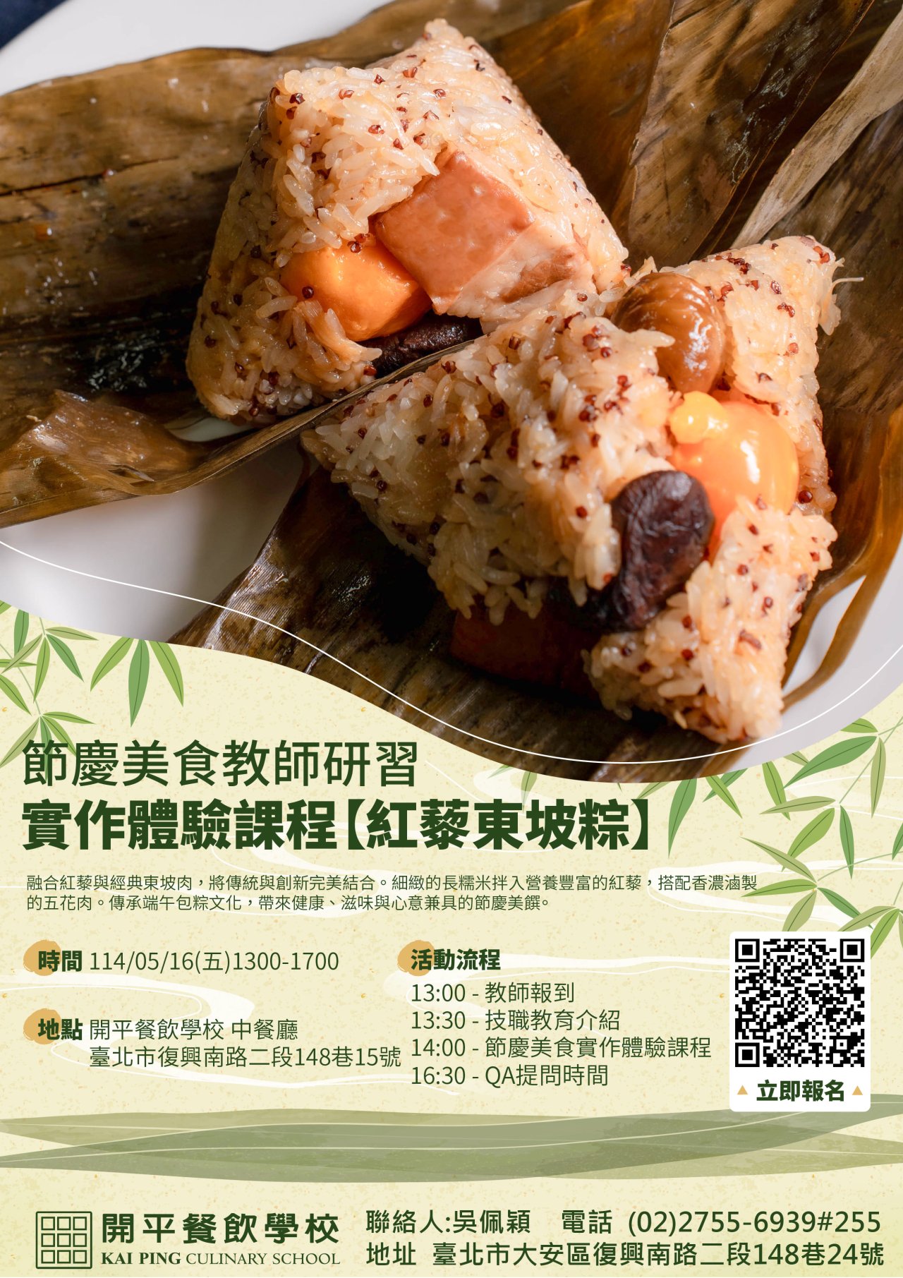 一、辦理日期:1140516日(五)13:00-17:00 二、研習對象:全國國中教師。 三、報名方式:採線上報名,請上全國教師在職進修資訊網報名,課程名稱:節慶美食教師研習,課程代碼: 4993113。報名截止日期:1140513日(二),課程名單將於開課前三天確認遴選名單。 四、研習集合時間、地點:當日下午13:00-13:20報到於開平餐飲學校之中餐廳。 五、研習地點:臺北市大安區復興南路二段14815號。 六、研習時數:全程參與者,俟研習結束後核給4小時研習時數。七、研習詳細內容請參閱實施計畫,有相關事宜,歡迎洽詢 2755-6939255,吳老師。