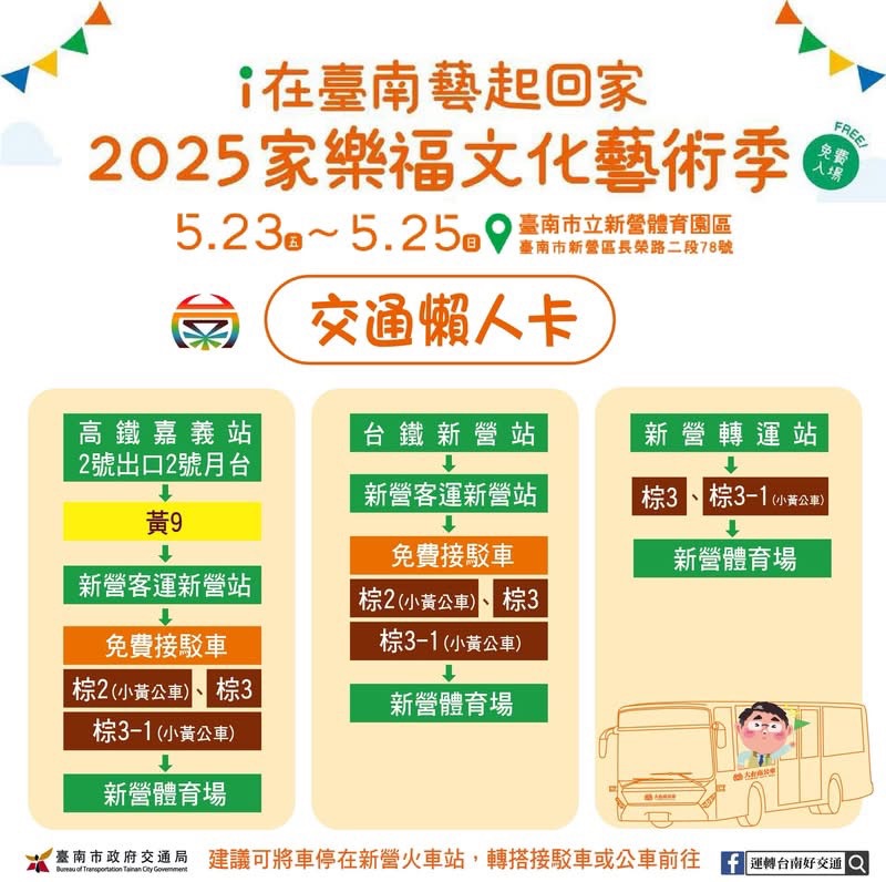 一、本局與財團法人家樂福文教基金會將於114523日(五)至 525日(日)於臺南市立新營體育園區舉辦2025家樂福文化藝術季,有日戲、夜戲演出與市集,全程免費入場,邀請共襄盛舉。 二、擬請貴校協助活動宣傳。 三、活動相關問題請洽(066321047分機1109劉敏慧助理員