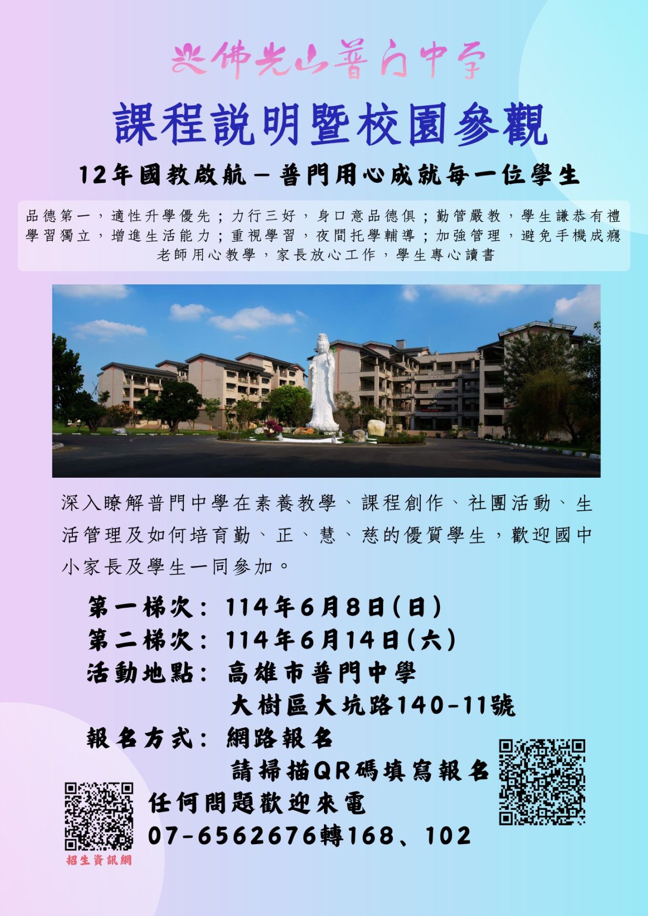 一、本校為一所住宿型學校,為提供國三畢業生及家長認識普門中學學習及住宿環境、課程與活動,讓即將就讀高中高職的孩子及家長能有更多的選擇,特別規劃招生活動--校園參觀暨課程說明會,歡迎國三畢業生的家長及學生參加 。 二、活動時間:第一梯次114年6月8日(星期日)下午2:00〜4:30。第二梯次114年6月14日(星期六)下午2:00~4:30。 三、活動地點:普門中學。 四、報名期限:即日起至活動當天皆可報名。 五、報名網址:https://forms.gle/EsyiXsimn5fKm1NP7 六、連絡電話:07-6562676#107、168、102