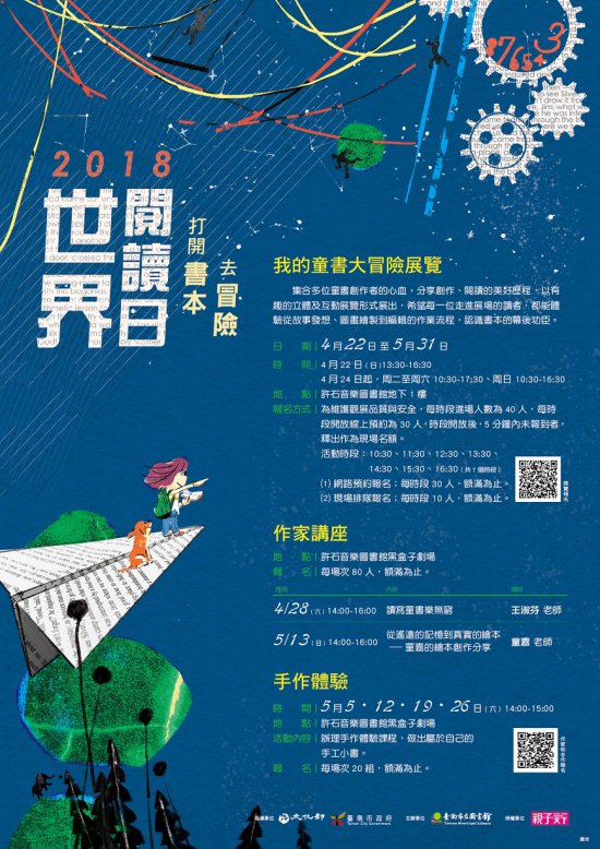 一、本館辦理「2018 世界閱讀日─我的童書大冒險」系列活動,活動內容包含:我的童書大冒險展覽、作家講座和手作體驗課程。展覽集結多位童書創作者的心血,把創作、分享、閱讀的美好歷程,以有趣的立體及互動展覽形式展出,希望每一位走進展場的大小讀者,都能體驗從故事發想