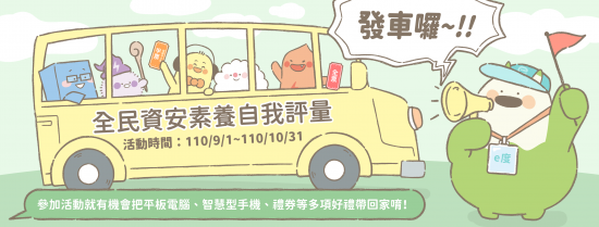 三、為培養學生建立健康、合理與合法的資訊科技使用態度與習慣,以增進網路學習正向效益,並提升教師資安素養與電腦防護能力,教育部自本(110)年 9 月 1 日至 10 月 31 日止舉辦「全民資安素養自我評量」活動,請各校協助將 banner 電子檔(如附件)置於學校網站,並連結本活動網站(網址: https:/isafeevent.moe.edu.tw/),請師生於活動期間內踴躍上網觀看動畫教材及檢測資訊安全素養認知程度,並有機會參與抽獎。