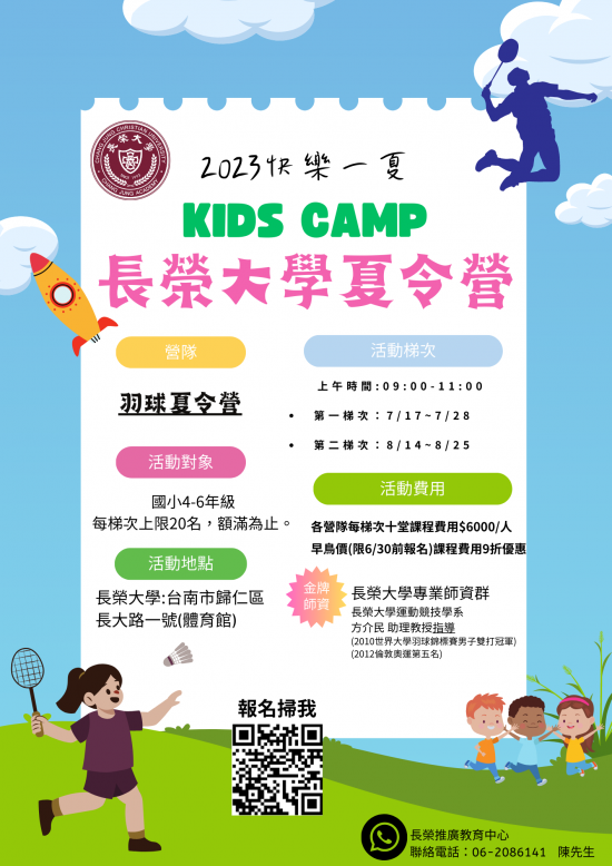 二、本次開設 3 個營隊「2023 快樂一夏長榮大學籃球夏令營」、「2023 快樂一夏長榮大學羽球夏令營」及「2023 快樂一夏長榮大學小小食物探險家夏令營」。