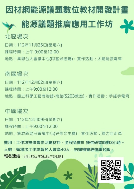 (一)北區場次工作坊:日期: 112 年 11 月 25 日(星期六);課程時間:上午 9:00 至 12:00 ;地點:集思台大會議中心(阿基米德廳);實作活動:太陽能發電車。