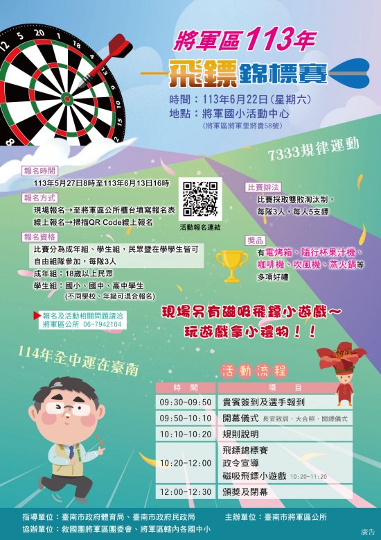 主旨:檢送本所辦理「將軍區 113 年飛鏢錦標賽」活動宣傳海報電子檔及報名表,請貴單位協助公告宣傳,並竭誠歡迎組隊參加,至紉公誼,請查照。