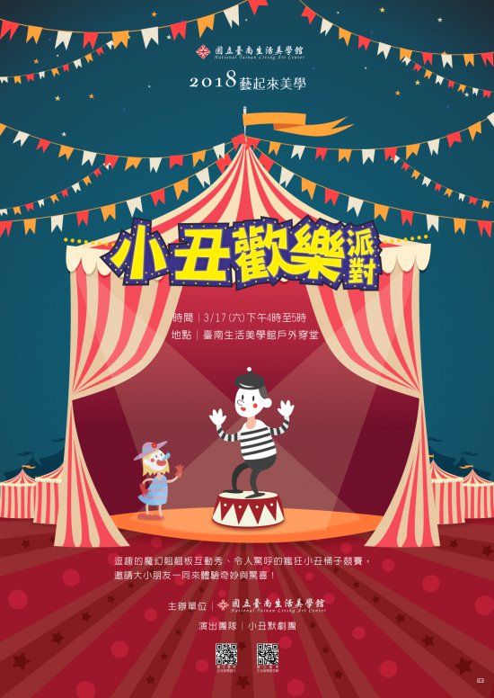 主旨:本館於 107 年 3 月 17 日辦理藝起來美學─「小丑歡樂派對」演出活動,敬請協助宣傳週知,至紉公誼,無任感荷。 說明: 一、本活動係邀請「小丑默劇團」擔任演出,演出時間: 3 月 17 日(六)下午 4 時至 5 時,地點:本館戶外穿堂(自由入座)。 二、小丑默劇團將帶來一場融合雜耍、魔術、默劇、汽球、疊杯等精彩元素的互動演出,邀請大小朋友們一同光臨驚奇逗趣的〈小丑歡樂派對〉! 三、活動新聞稿及海報圖檔詳如附件