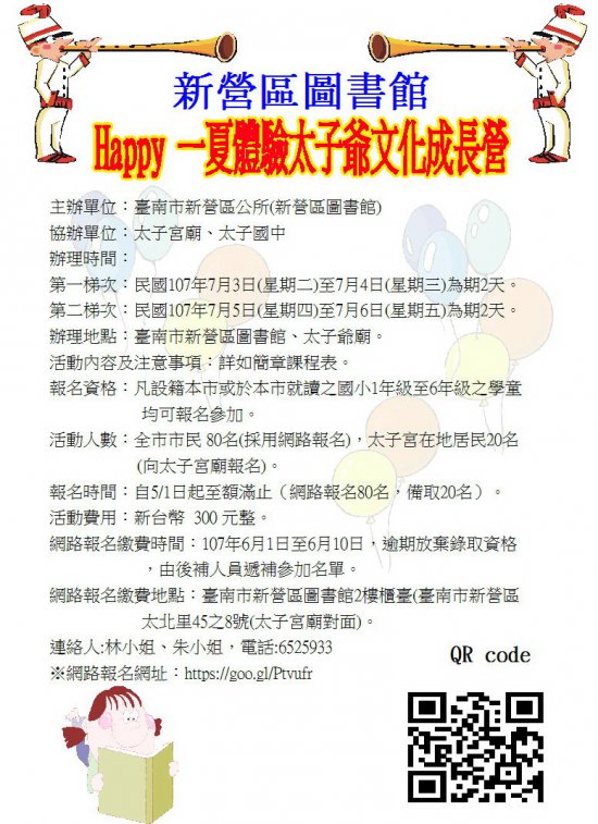 主旨:本區圖書館訂於本( 107 )年 7 月 3 日至 7 月 6 日辦理 2018 happy 一夏「體驗太子爺文化成長營」,敬請貴單位協助張貼,並利用所屬網站及臉書等各式管道宣傳周知,至紉公誼,請查照。 說明:檢附 2018 happy 一夏「體驗太子爺文化成長營」活動簡章及活動海報。