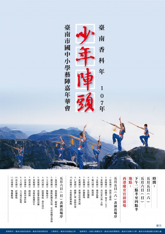 主旨:本所訂於 107 年 5 月 5 、 6 日(星期六、日)假本區慶安宮前廣場舉辦「107 年臺南市國中小學藝陣嘉年華會」活動,隨文檢附活動文宣 1 份,請惠予協助宣傳並鼓勵踴躍前往觀賞,請查照。