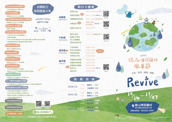 主旨:檢送本局「2021 德元埤荷蘭村風車節」活動摺頁(電子檔),請貴單位惠予協助於線上宣傳周知,俾利活動圓滿舉行,請查照。 說明:活動詳情可洽詢本局(06-6350190)及德元埤旅遊服務中心(06-6231896)。