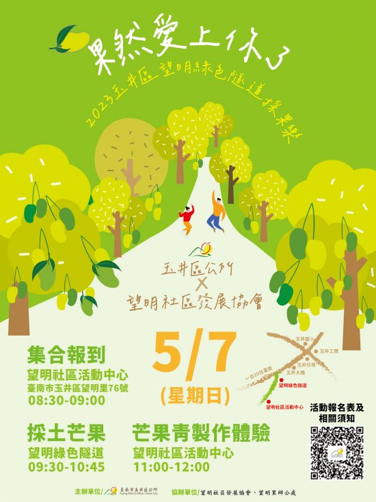 主旨:檢送本所辦理 2023 年臺南市玉井區望明里綠色隧道採果樂「果然愛上你了」宣傳圖檔 1 份,敬請貴公所協助宣傳週知,請查照。