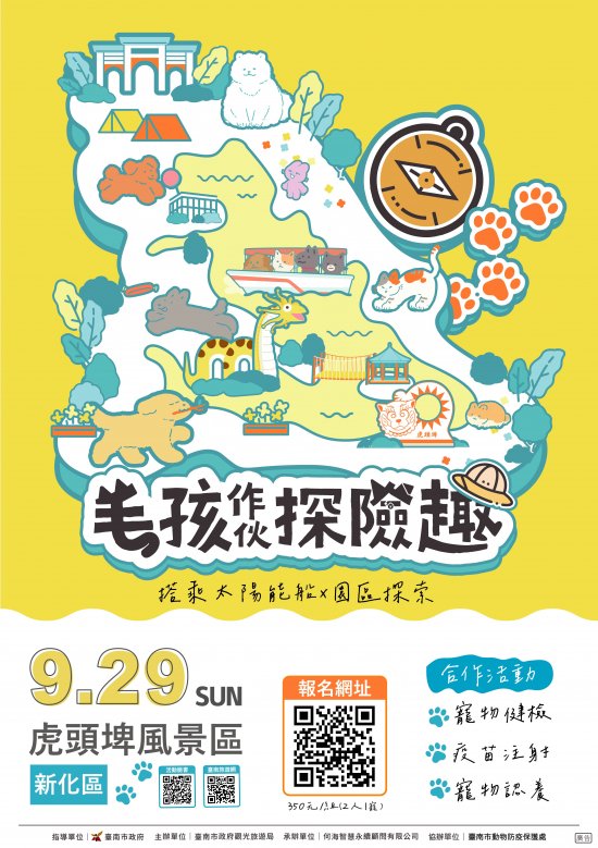 二、即日起開放 2 人 1 寵為組報名,報名網址(https://reurl.cc/KllbRq),歡迎報名參加,跟著毛孩搭太陽能船漫步百年勝景,作伙探險虎頭埤。