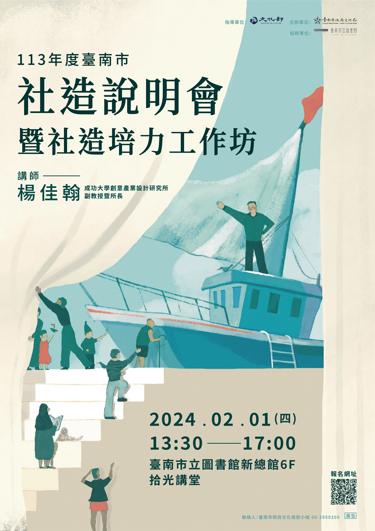 網站(https://lifelonglearn.dgpa.gov.tw/ 報名此課程,搜尋課程: 113 年度臺南市社造說明會暨社造培力工作坊(課程代碼: cul20240201)。