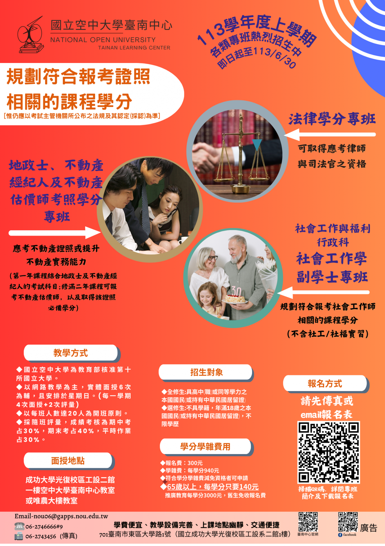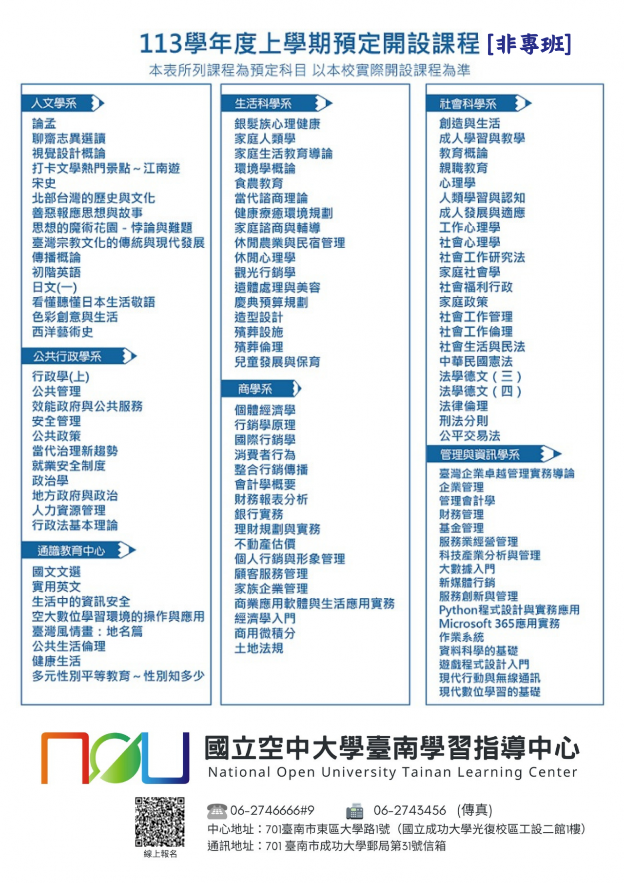 七、檢送本校 113 學年上學期招生 DM 及簡章,敬請惠予協助張貼宣傳,招生詳情及線上報名請連結本校臺南學習指導中心網址: https://reurl.cc/OM5gX9 ,連絡電話:06-2746666 轉 9 。