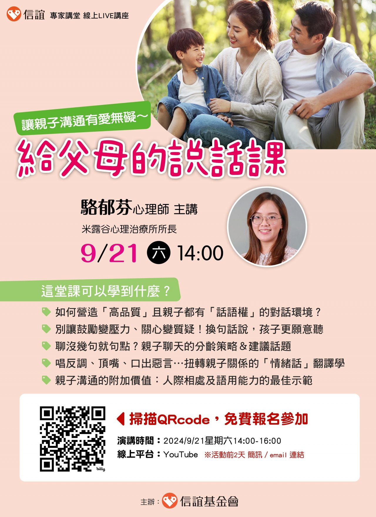 一、親子之間的溝通,不只是傳達大人的想法與期待,也要提供孩子表達的機會。如何做,能讓孩子感受被理解、被尊重?如何說,能讓孩子願意聽又不會壞了親子關係?信誼將於 2024 年 9 月 21 日(六)下午 2 : 00-4 : 00 舉辦【溝通有愛無礙~給父母的說話課】線上 LIVE 講座,邀請爸媽免費報名參加。