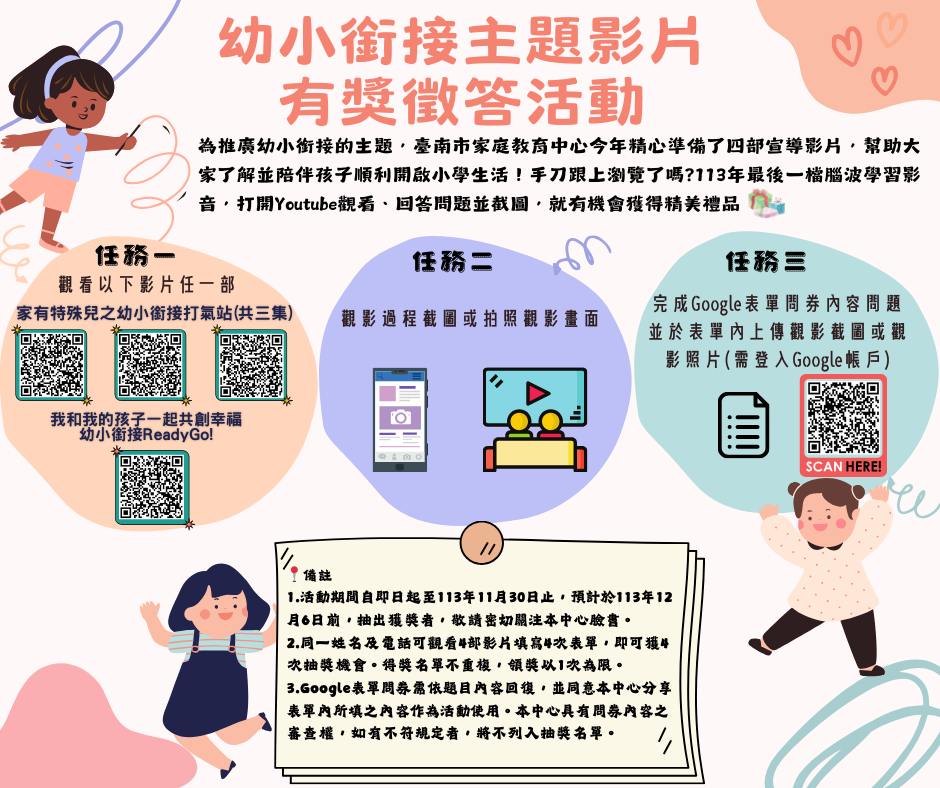 (二)活動內容:觀看以下四部幼小銜接影片任一部並完成 Google 表單問題,就有機會獲得精美禮品。