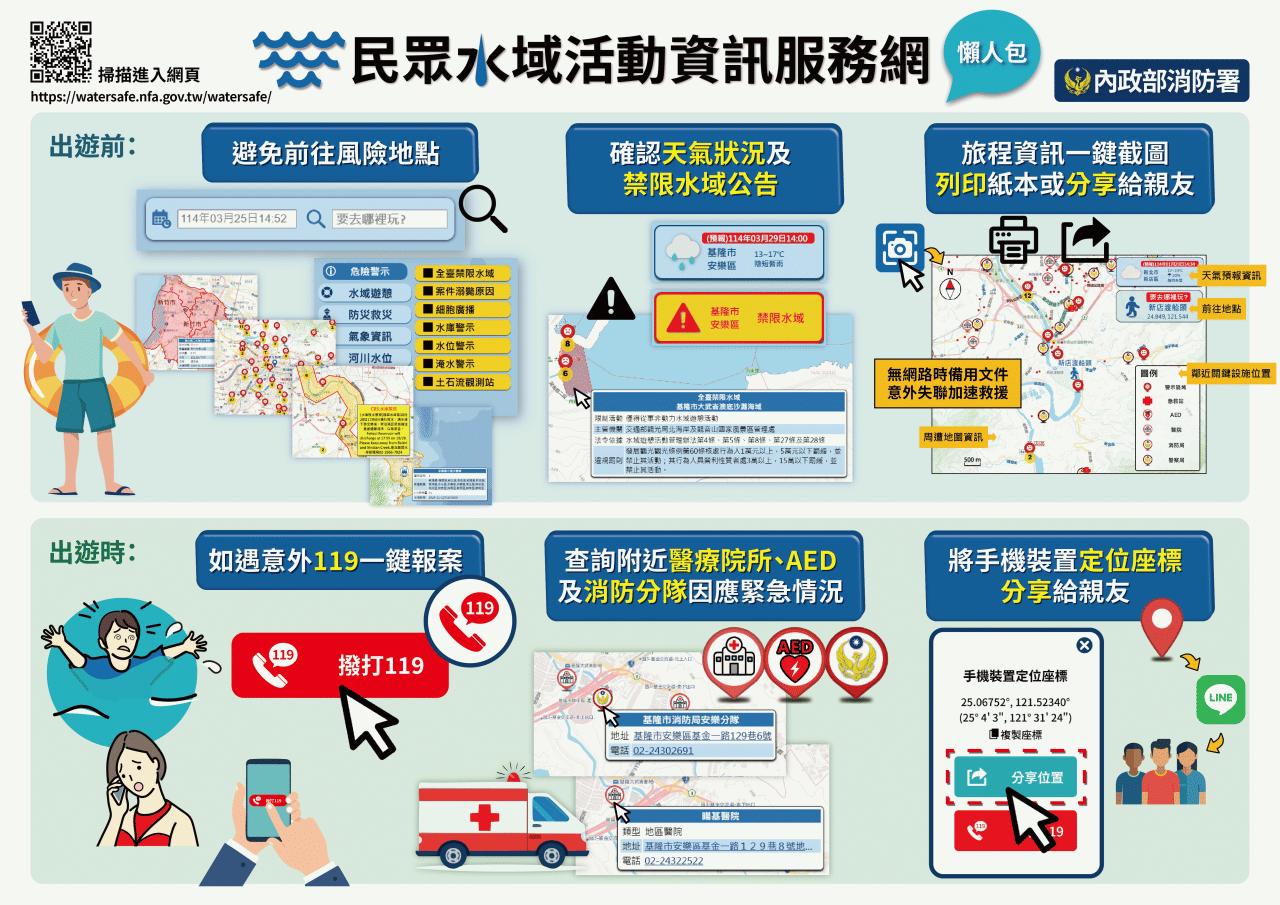 內政部消防署業透過優化既有系統,進一步將過往歷史案件的大數據統計分析結果加值應用,並於 113 年度完成建置「民眾水域活動資訊服務網頁」( 網頁連結: https://watersafe.nfa.gov.tw/watersafe/ )