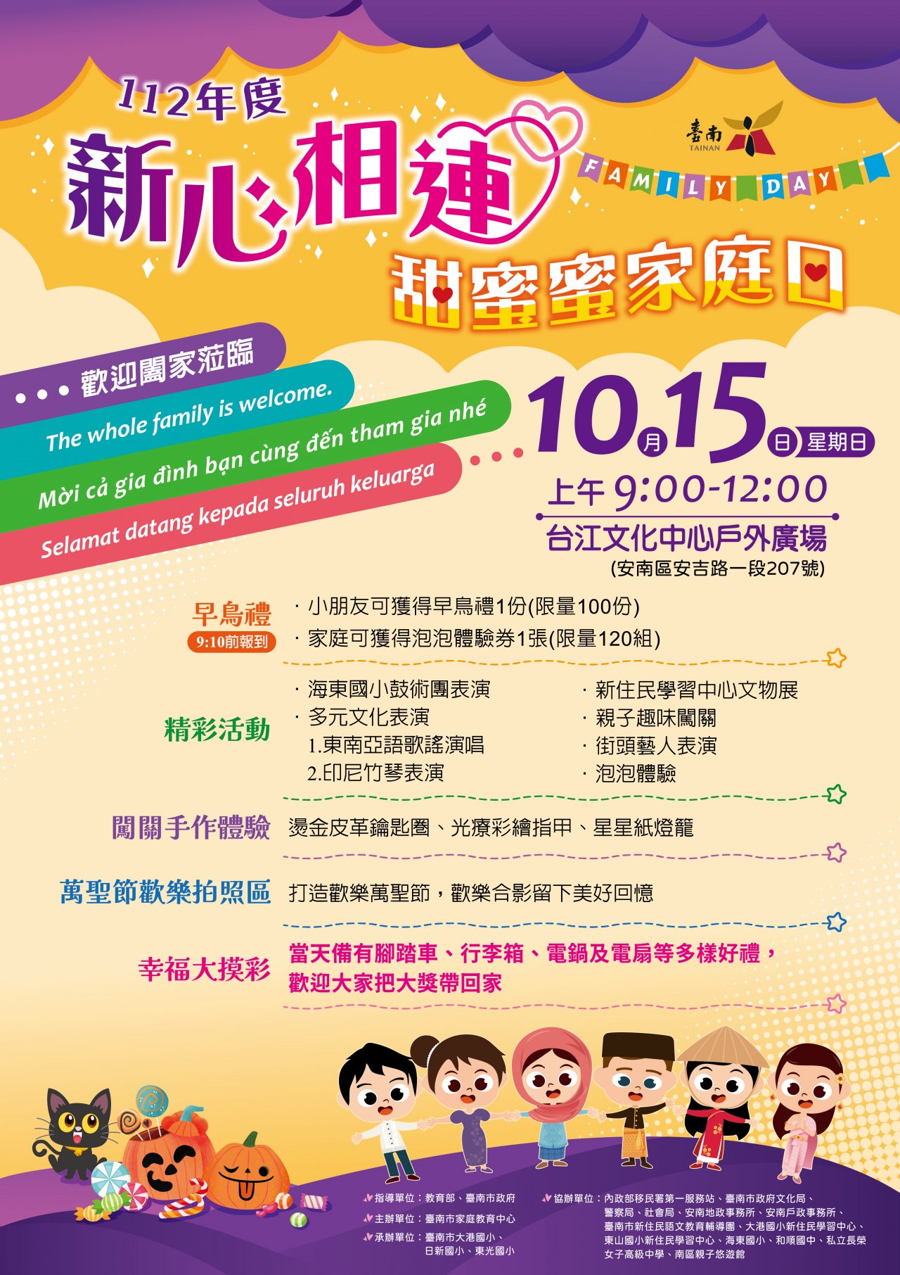 (三)內容:開場活動鼓術團表演、多元文化表演、親子闖關活動、萬聖節歡樂拍照區、闖關手作體驗、泡泡體驗、甜蜜蜜糖果分享及幸福大摸彩等,完成闖關即送精美禮物 1 份。
