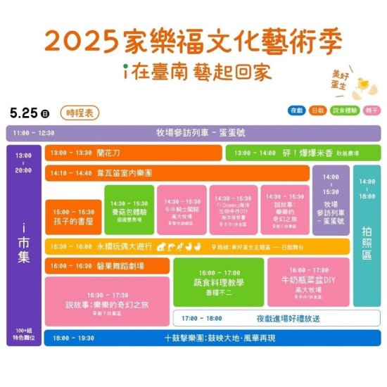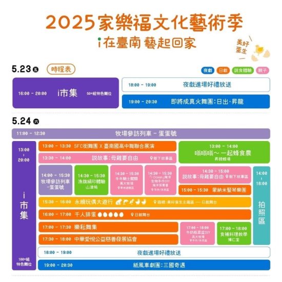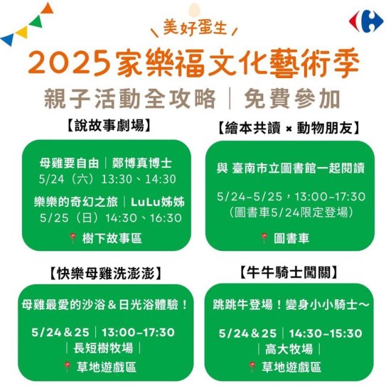 本局與財團法人家樂福文教基金會將於 114 年 5 月 23 日(五)至 5 月 25 日(日)於臺南市立新營體育園區舉辦 2025 家樂福文化藝術季,有日戲、夜戲演出與市集,全程免費入場,邀請共襄盛舉。