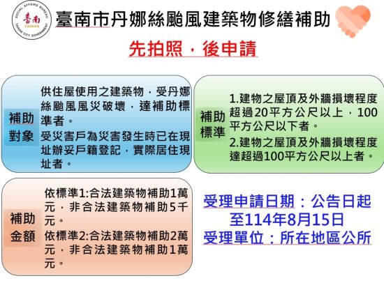 因應本次「丹娜絲颱風」重創南市多處地區,為協助受災民眾,臺南市政府補助標準如附件圖表。