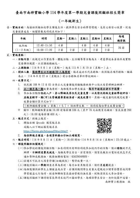 114 學年度一年級課後照顧班報名簡章已隨新生訓練通知信件寄出,提醒您報名期限至 8/14 晚上 23:59 截止喔!