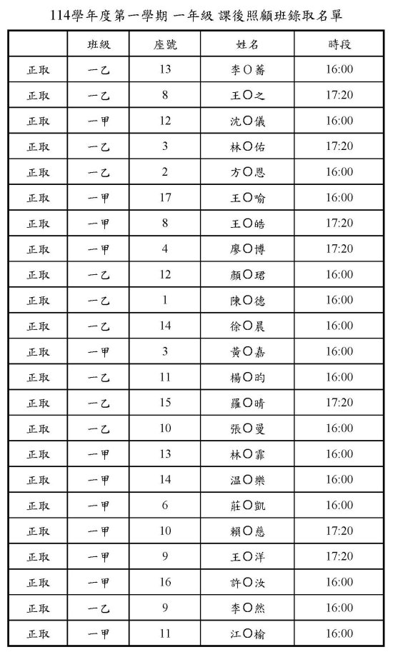 本校 114-1 學期一年級課照班錄取名單詳如附件,若有任何問題請洽詢教務組 06-6562904 分機 809 。
