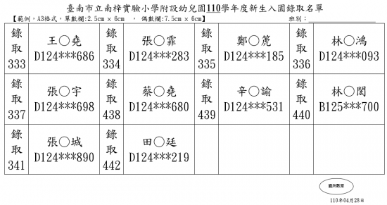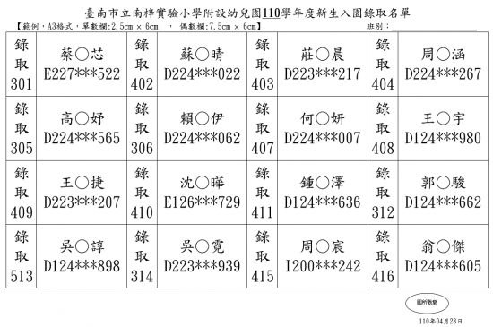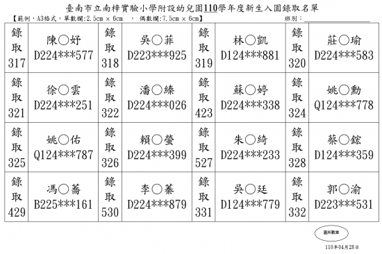 110 學年度新生入園第一次招生共登記 42 人,名單如上,請錄取幼生之家長於 4/29 上午 11 點至 4/30 中午 12 點前攜帶「報到單」與「郵局存摺影本」到幼兒園辦公室辦理報到手續。