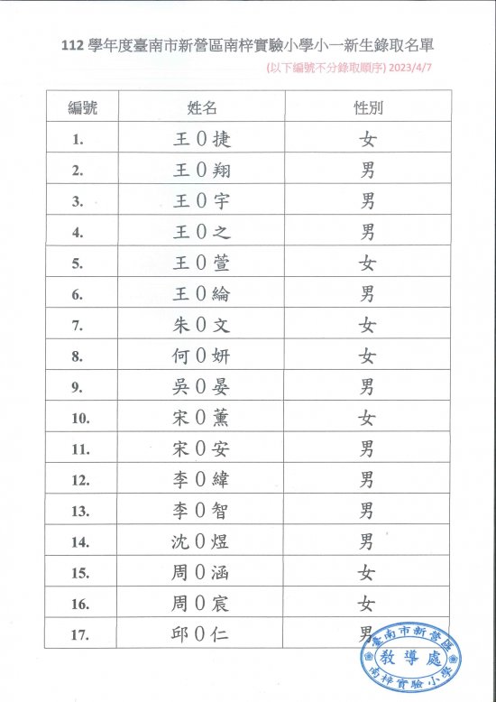 首先,歡迎貴子弟來南梓實驗小學就讀,以下附件為 112 學年度小一新生報到錄取名單。
