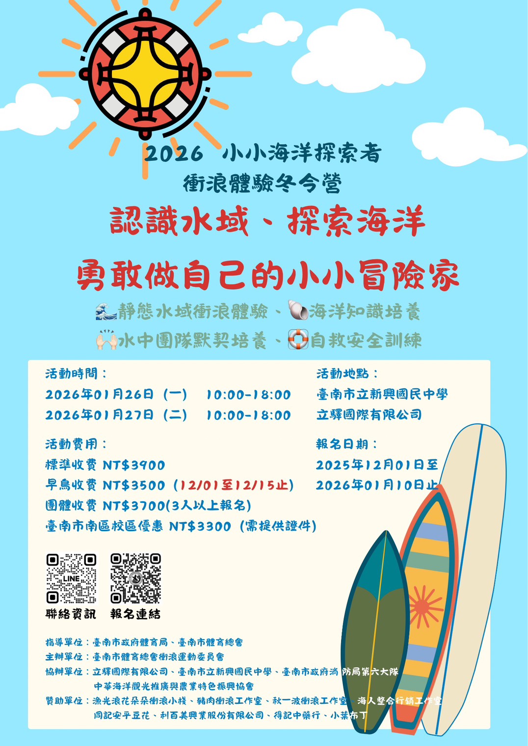 轉知--社團法人臺南市體育總會(衝浪運動委員會)辦理「小小海洋探索者-冬令營」相關資訊 (體育陳韻如)