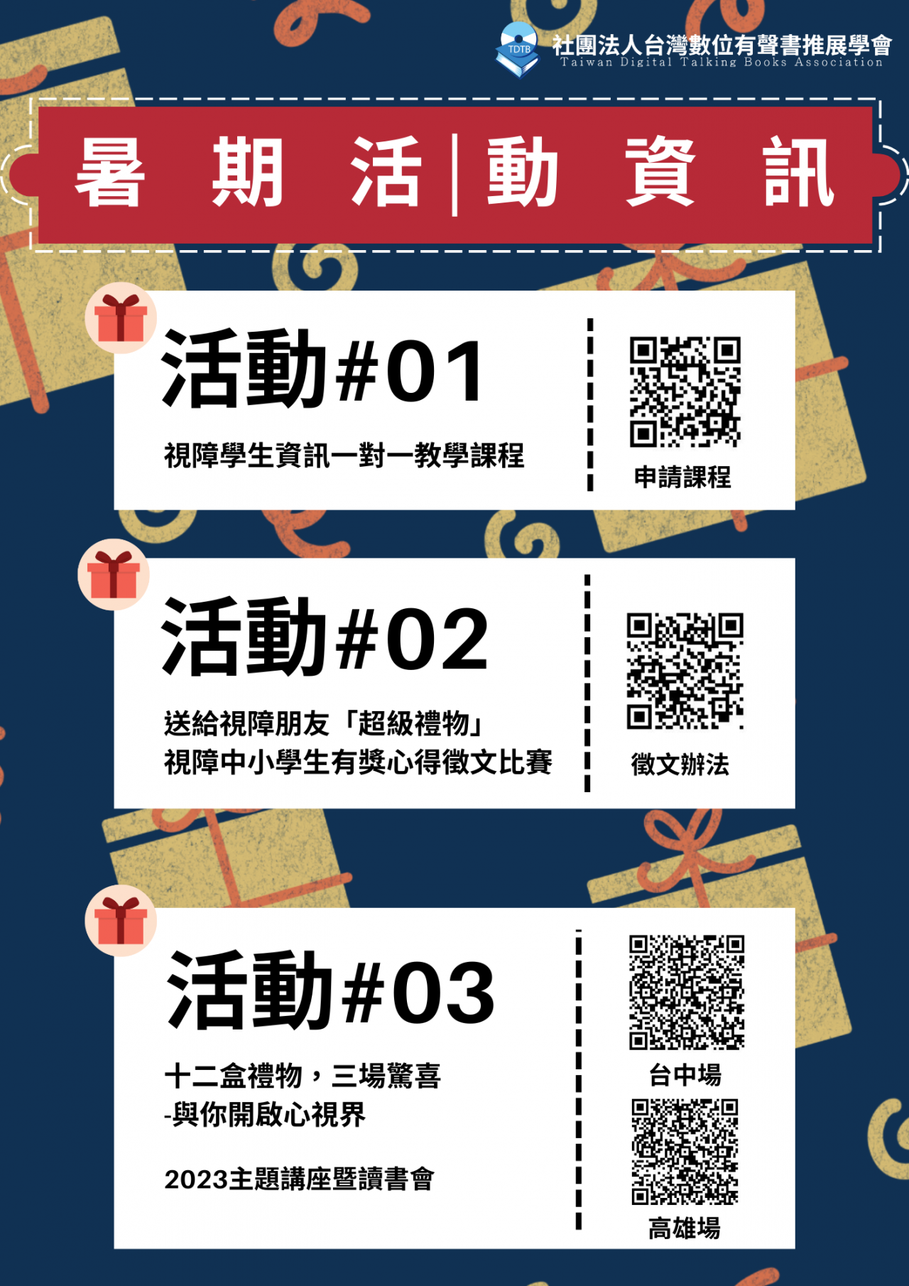 二、暑期活動涵蓋 1 對 1 資訊輔具教學,另以《超級禮物》書籍為串聯,開辦讀書會暨專題講座及進行視障中小學生閱讀有獎徵文比賽,鼓勵視障學子運用資訊閱讀及寫作技能。