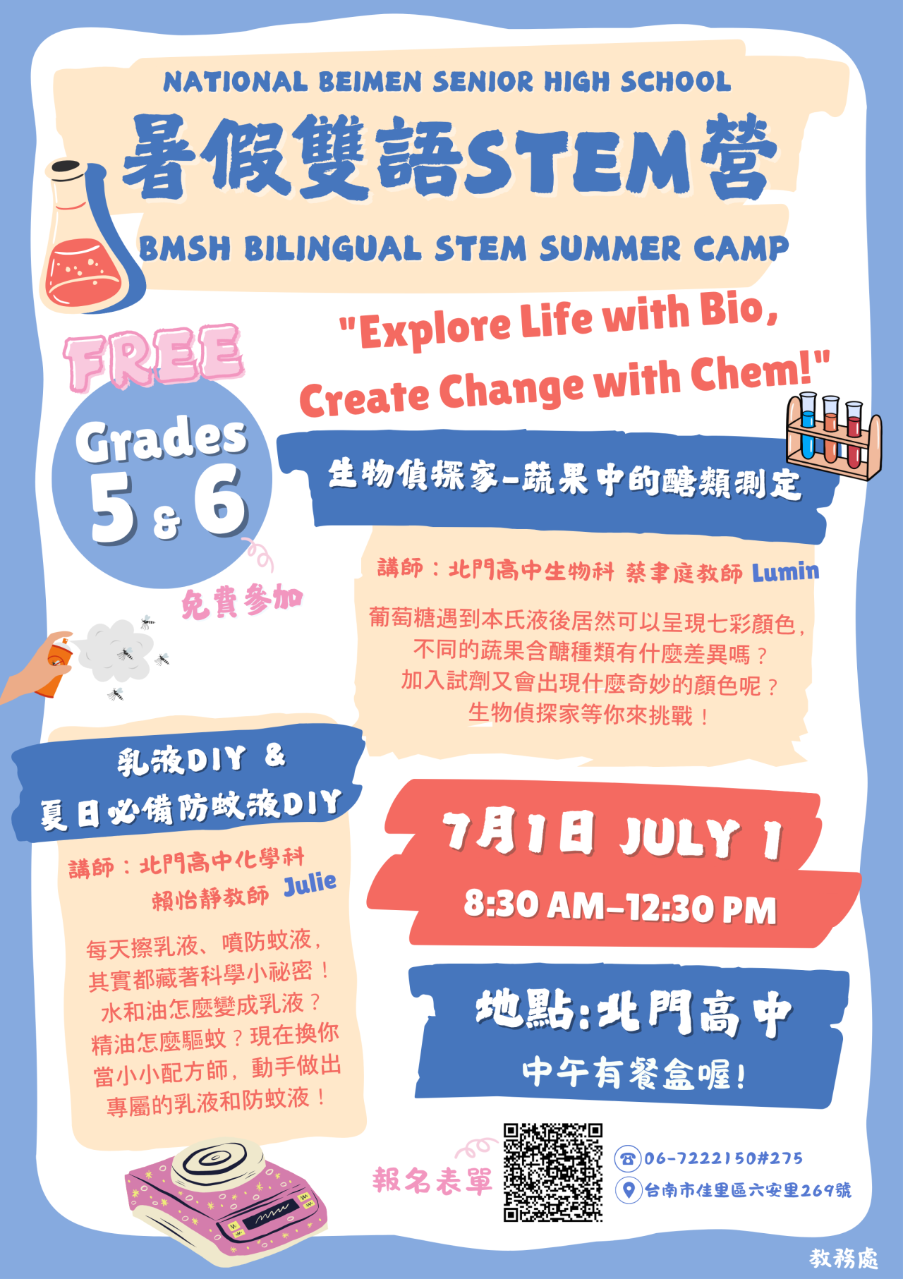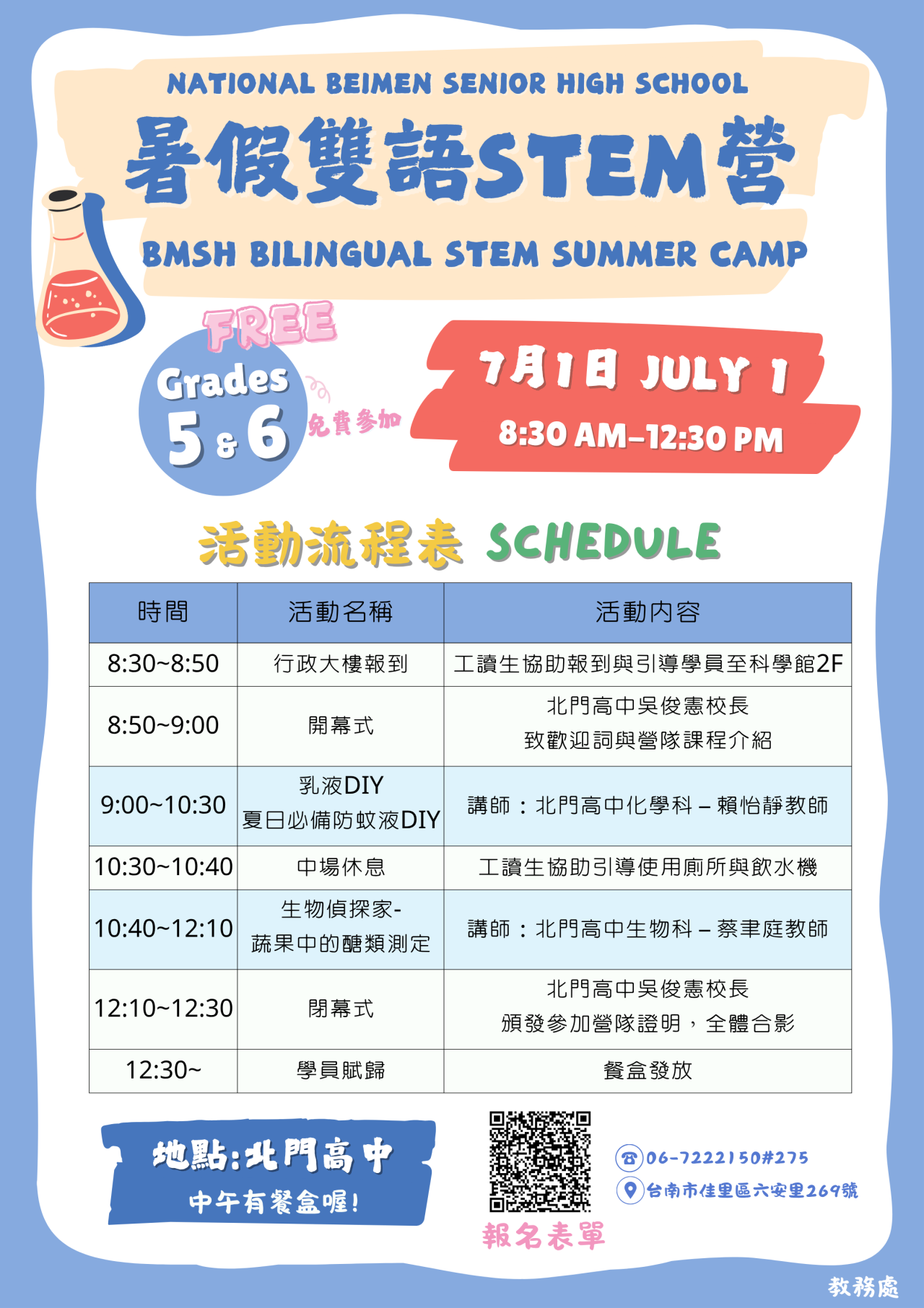 一、為提升大北門地區學生之自然科學探究能力與英語應用素養,本校特於暑假期間辦理「暑假雙語 STEM 營 BMSH Bilingual STEM Summer Camp」。