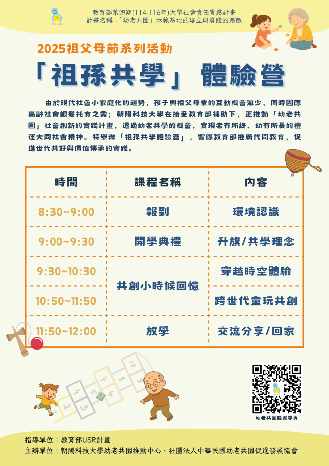 (一) 主要推廣幼老共園及代間教育之理念,輔導幼兒園及國小開設「幼老共學課程」,以促進世代關係與薪傳價值。
