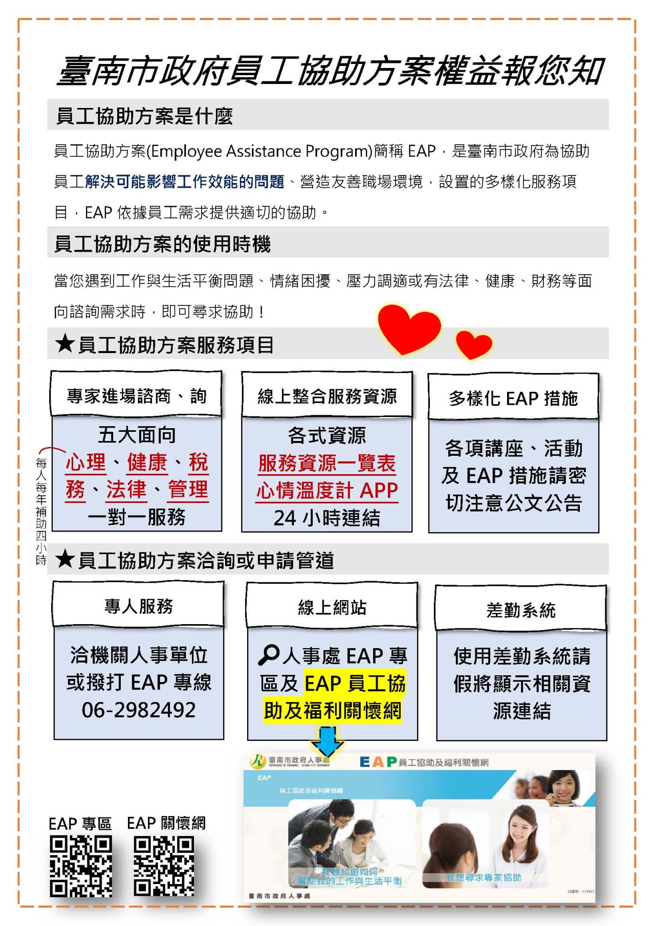 員工協助方案(簡稱 EAP )是為協助員工解決可能影響工作效能的問題、營造友善職場環境,設置的多樣化服務項目, EAP 依據員工需求提供適切的切助,轉知本府提供相關管道及資源供同仁參考使用