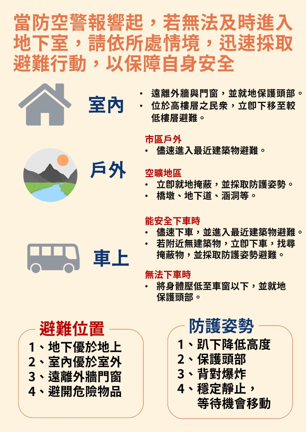 為協助外藉人士在臺期間於防空警報發布時,得依所在情境迅速判斷,採取適切行動,確保避難安全,特訂定本英文圖卡。