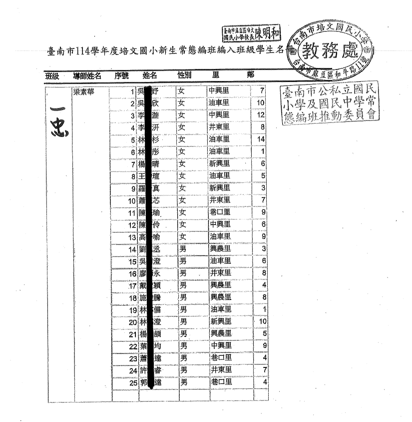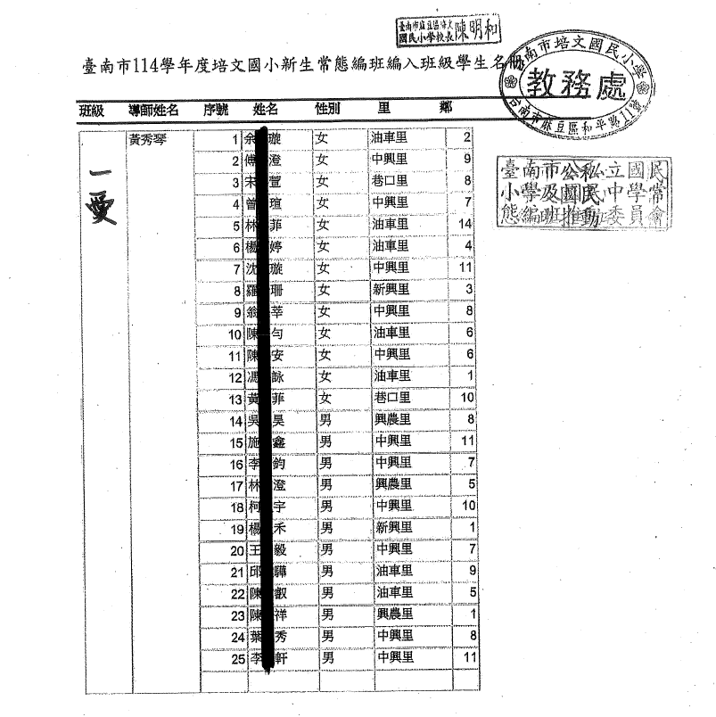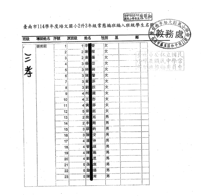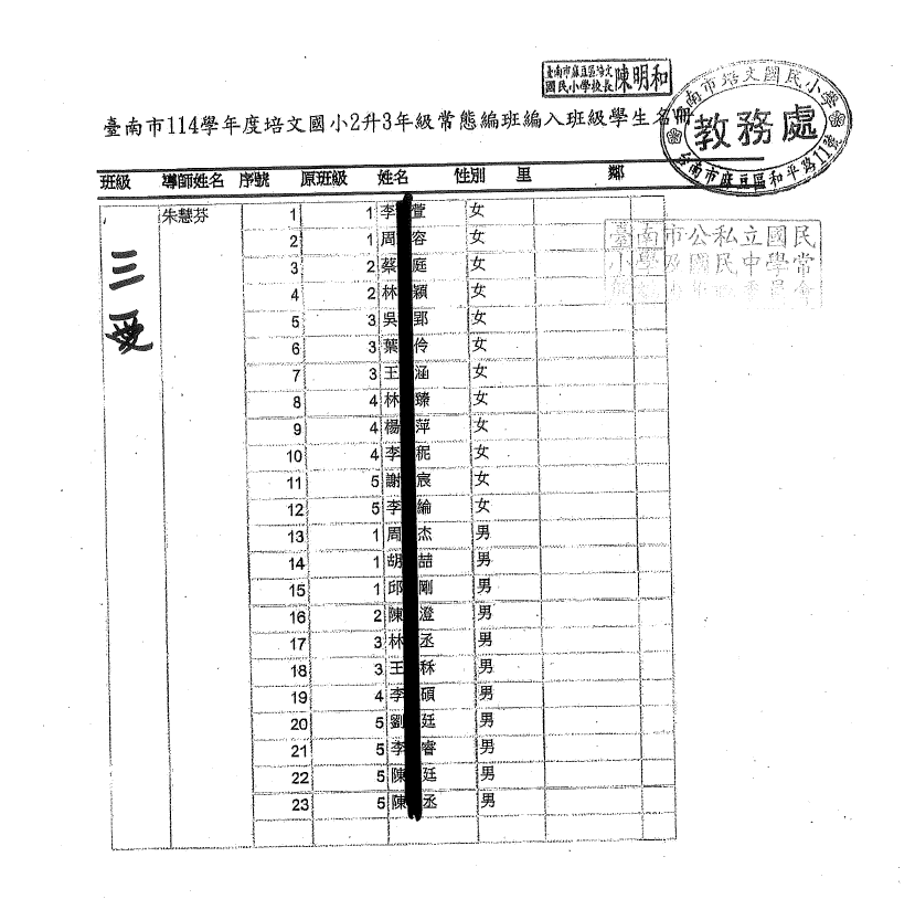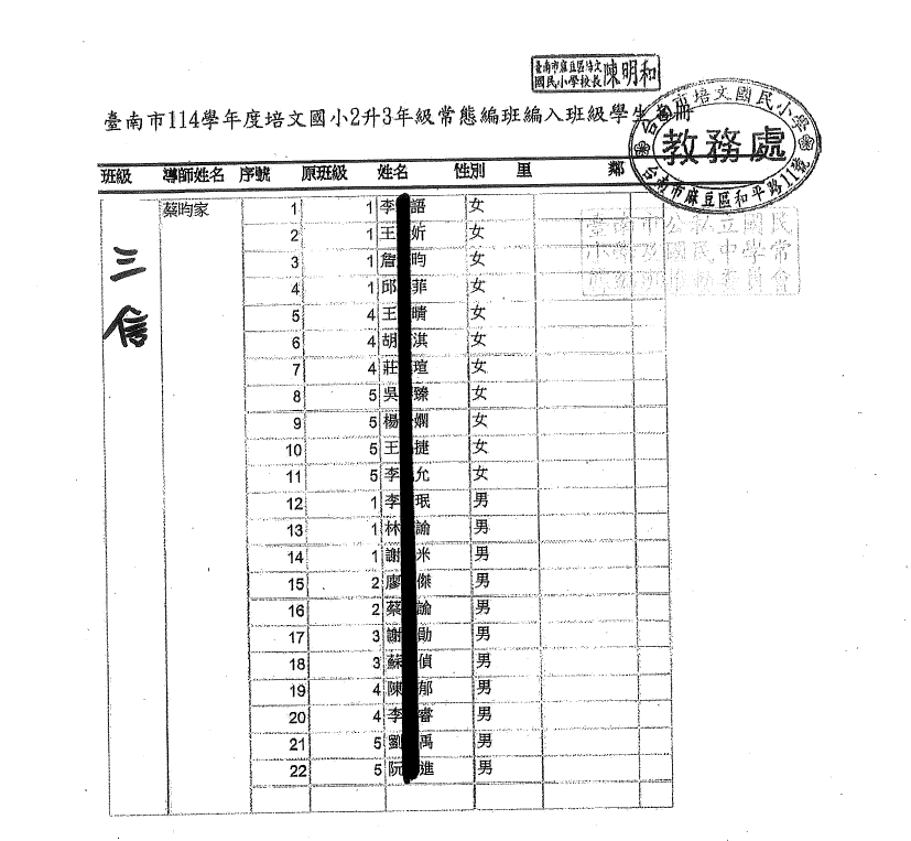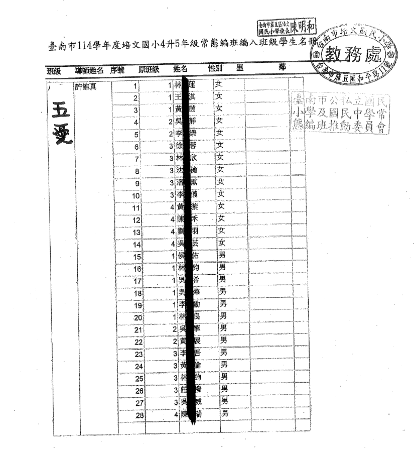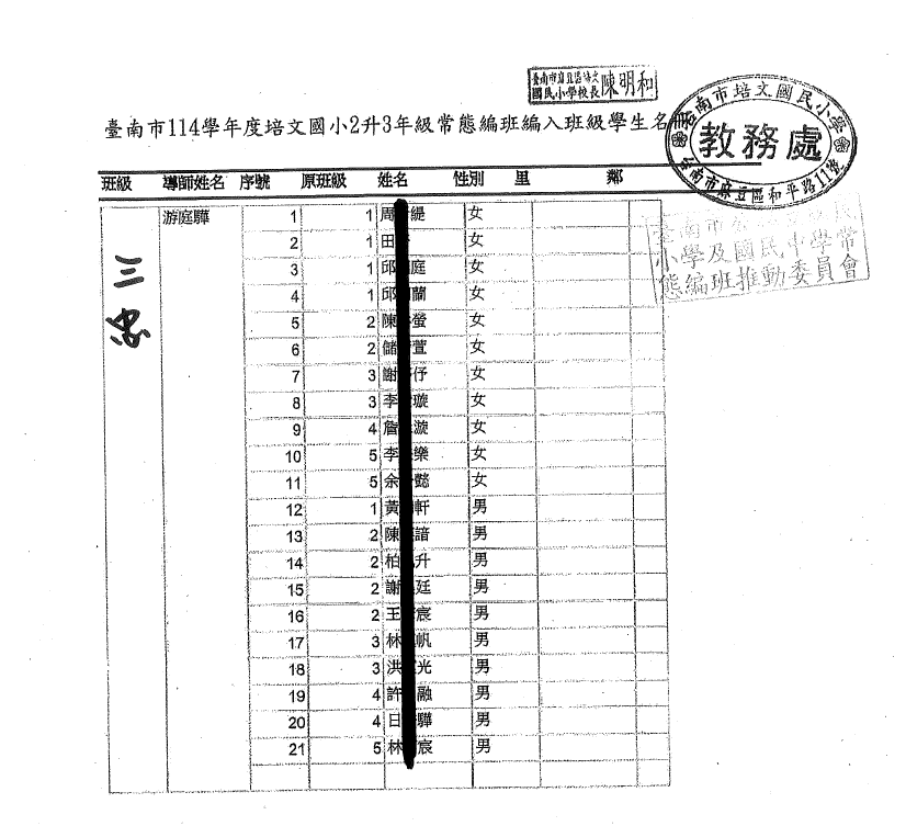 臺南市 114 學年度常態編班作業已於 07/31(四)完成,本校一、三、五年段常態編班班級學生暨導師名單,如附檔: