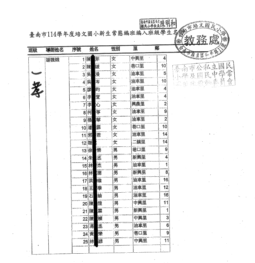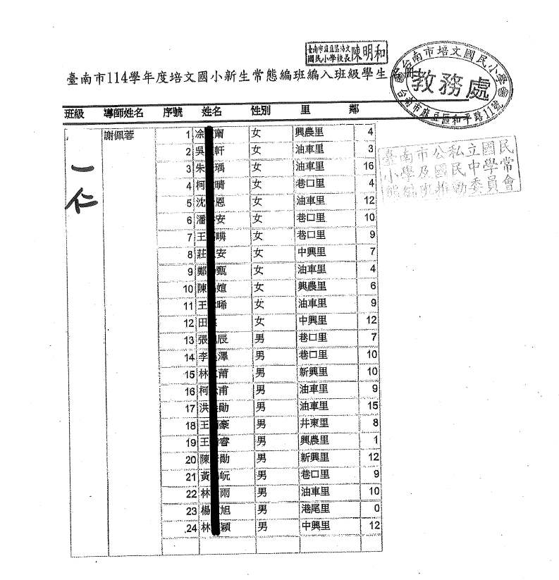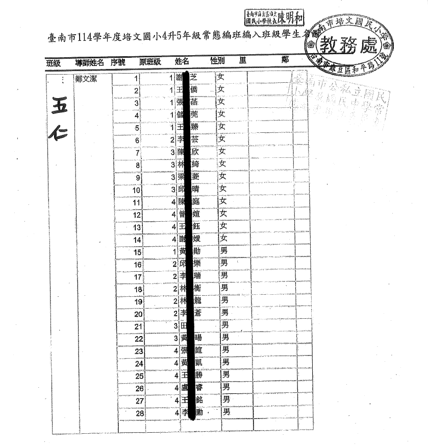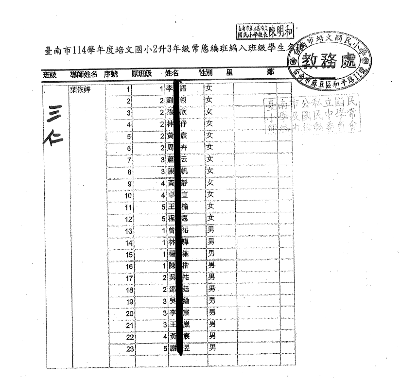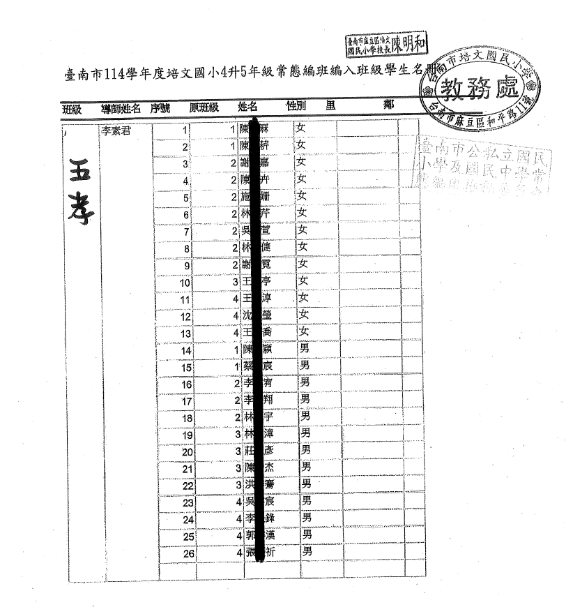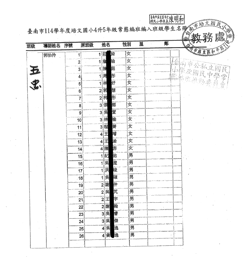 臺南市 114 學年度常態編班作業已於 07/31(四)完成,本校一、三、五年段常態編班班級學生暨導師名單,如附檔: