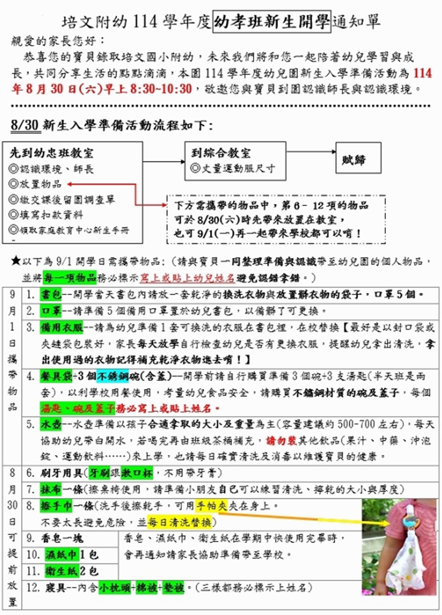請家長可先檢視附件的通知單為寶貝將開學所需的物品準備好-。