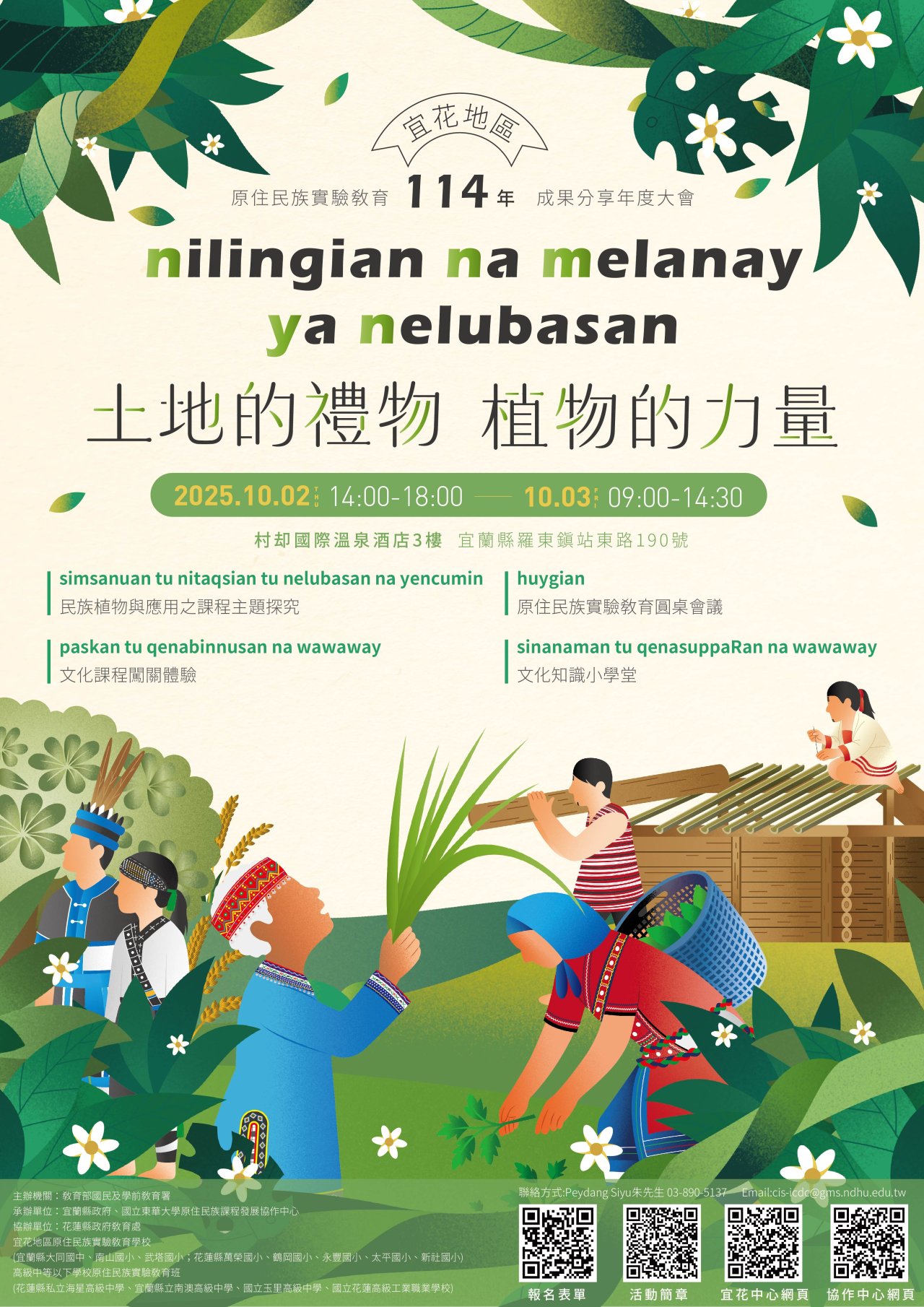 二、轉知國立東華大學原住民族課程發展協作中心辦理「nilingianna melanay ya nelubasan 土地的禮物,植物的力量─114 年宜花地區原住民族實驗教育成果分享」實施計畫書及活動海報乙份,鼓勵所屬人員參加。