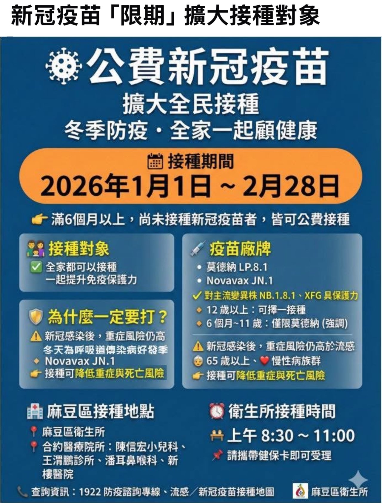 新冠疫苗公費接種對象自 115 年 1 月 1 日起擴大為「滿 6 個月以上尚未接種之民眾」,至 115 年 2 月 28 日止。