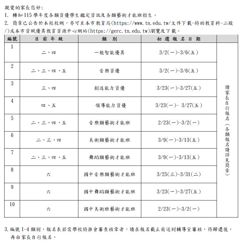 詳細簡章已公告於本校校網,亦可至本市教育局(https://www.tn.edu.tw/文件下載-特幼教育科-二股/)或本市資賦優異教育資源中心網站(https://gerc.tn.edu.tw)或各報名學校瀏覽及下載。