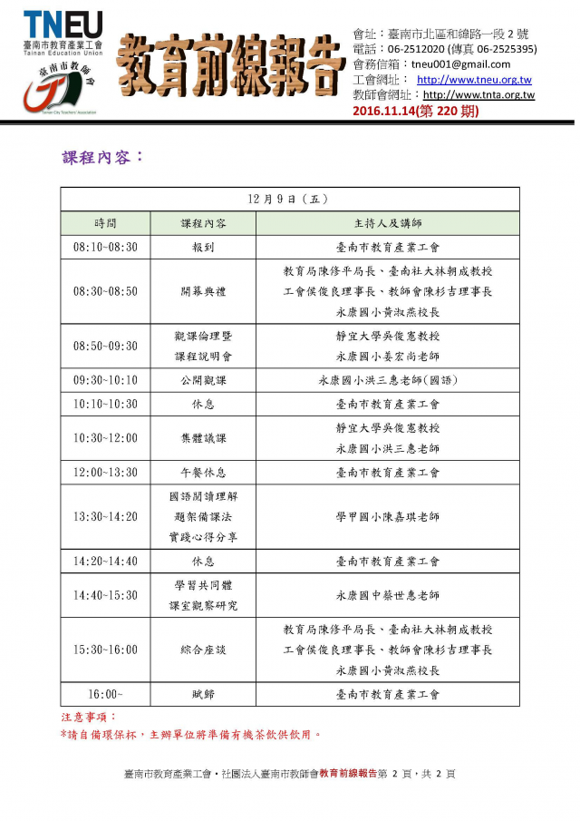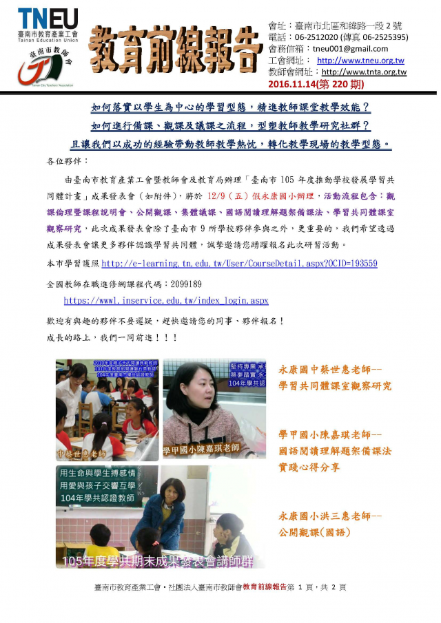 20161114教育前線報告(2016臺​南市學習共同體實施成果發表會)(220期​)