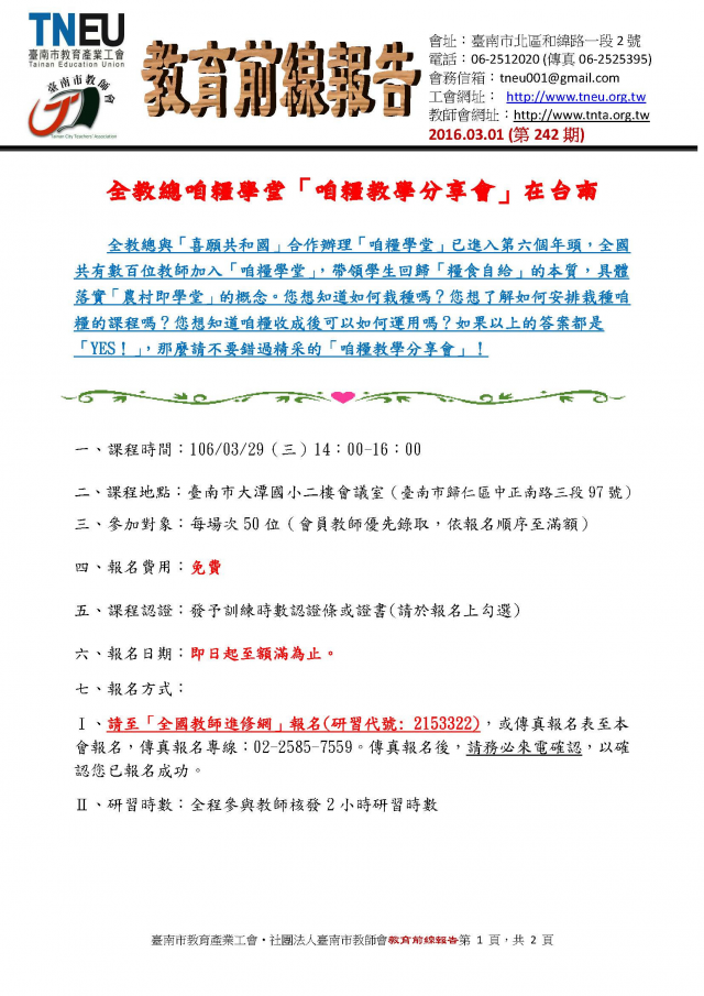 20170301 教育前線報告(全教總咱糧學堂「咱糧教學分​享會」在台南)(第242期)