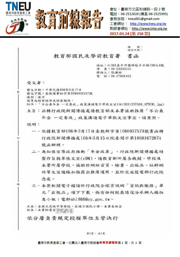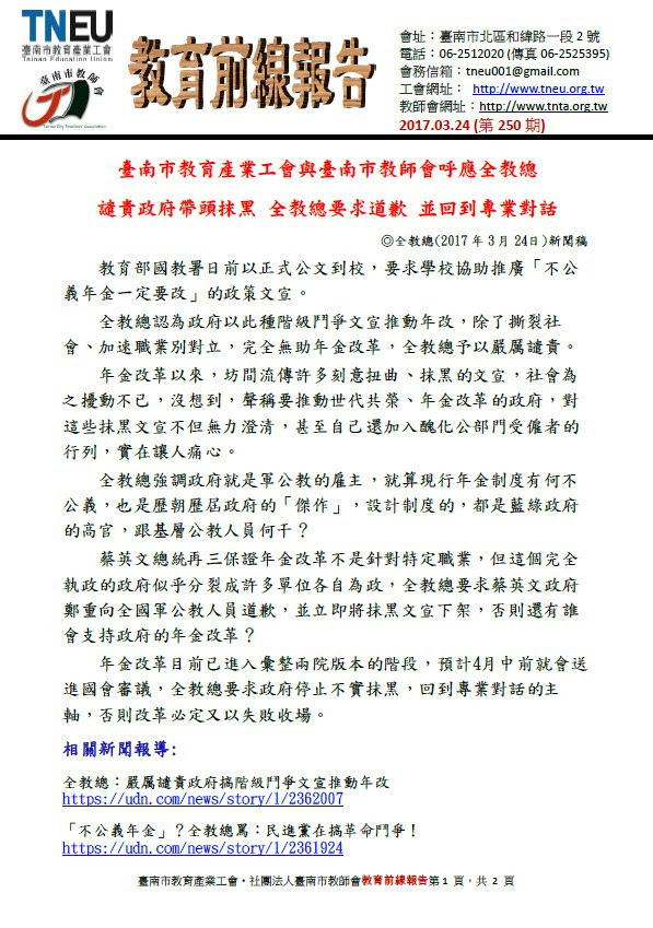 20170324教育前線報告(臺南市教育​產業工會與臺南市教師會呼應全教總 譴責政府帶頭抹黑 全教總要求道歉 並回到專業對話)(第250期)