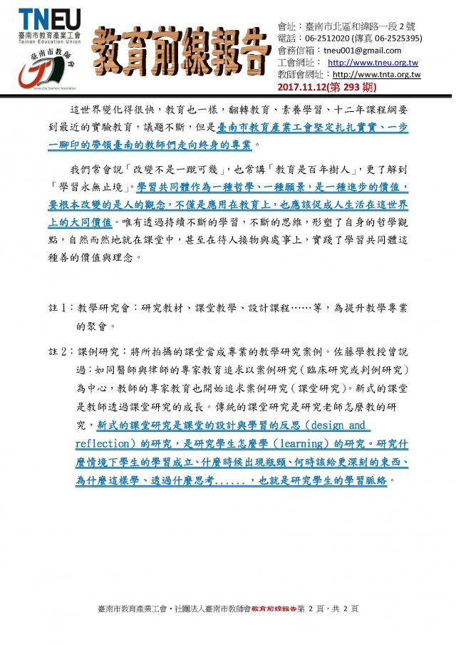 20171112教育前線報告(學共理念「TED教學法」 國小教學現場實踐與研究)(第293期)