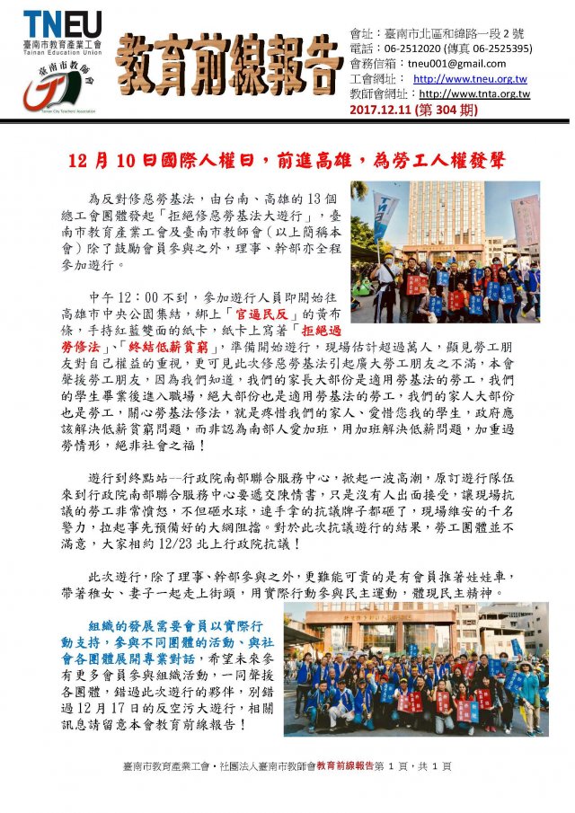 20171211教育前線報告-(12月10日國際人權日,前進高雄,為勞工人權發聲)(第304期)