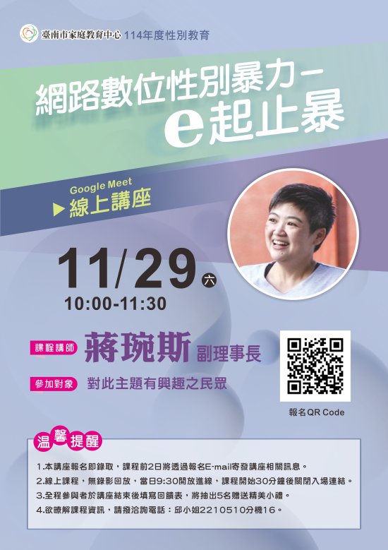 臺南市家庭教育中心辦理「網路數位性別暴力-e 起止暴」Google Meet 線上講座,歡迎踴躍參加。