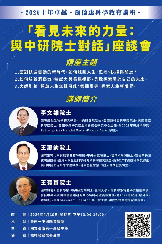 二、為啟發國高中青年學子對演化生物學、生物化學與結構生物學、大氣科學等相關領域的興趣,增進對其理解,本校特邀請中央研究院李文雄院士、王惠鈞院士、王寶貫院士蒞臨演講,講座內容兼具深度與啟發性,誠摯邀請貴校師生踴躍參加。