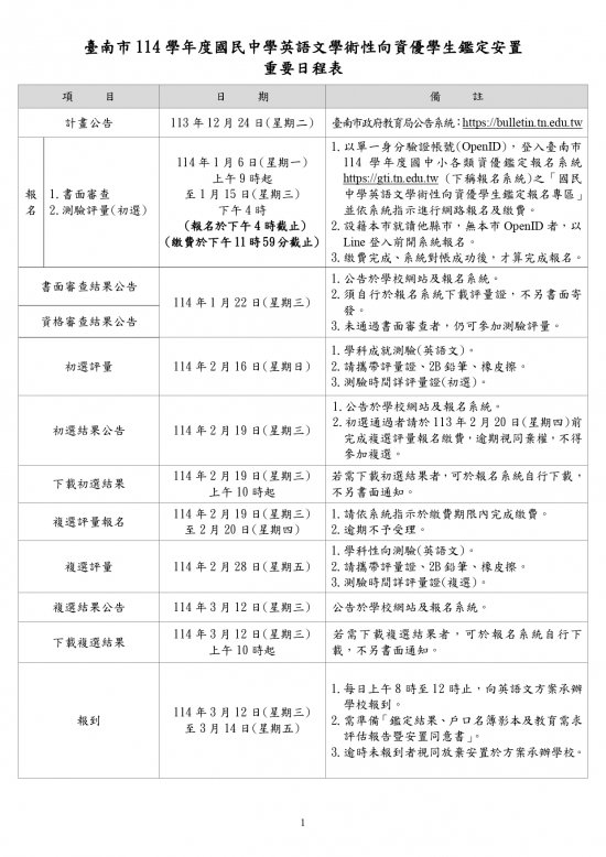 「臺南市 114 學年度國中小各類資優鑑定報名系統」(下稱報名系統)之 「臺南市 114 學年度國民中學英語文學術性向資優學生鑑定安置」並 依系統指示進行網路報名及繳費。