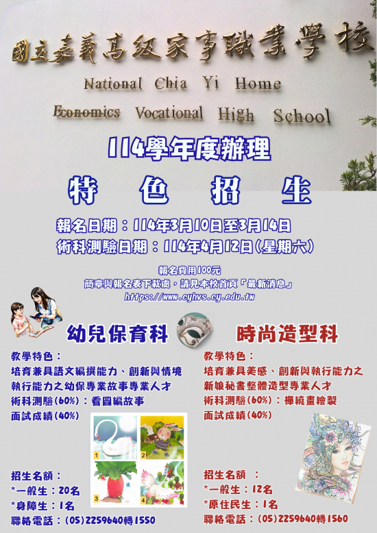 五、本校 114 學年度特色招生專業群科甄選入學簡章及報名表已公告於首頁,開放查詢或下載列印,請有意報考學生務必詳閱簡章內容。
