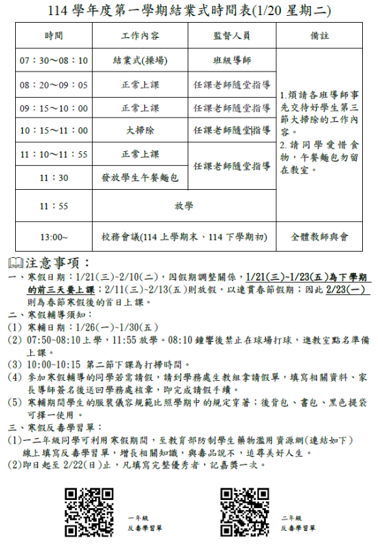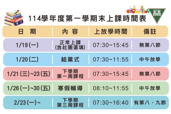 親愛的同學與家長您好:期末及寒假前後上課時間有所調整(如附圖所示),請同學依時到校上課;也請家長留意各日放學時間,協助孩子準時接送,感謝配合!預祝寒假愉快充實、龍馬精神、馬年行大運~