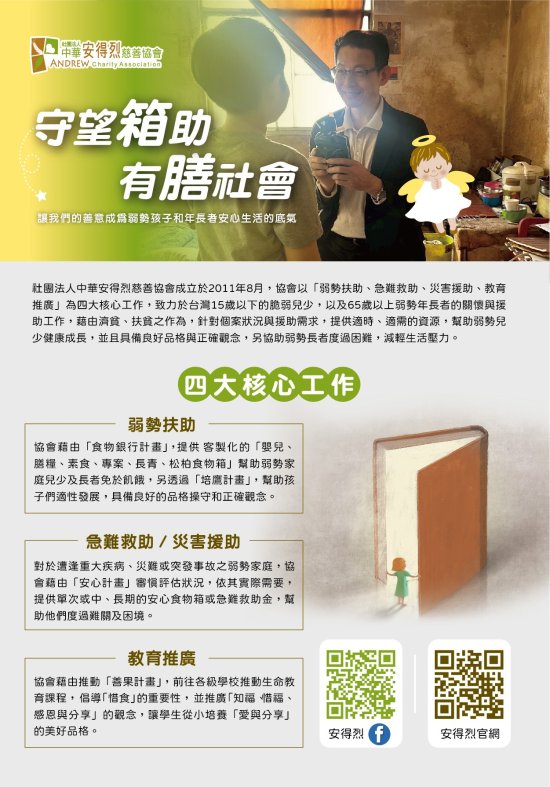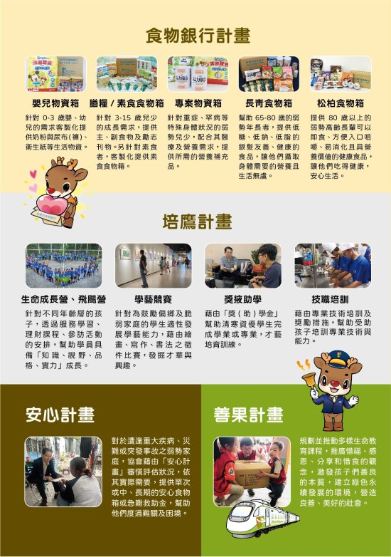 二、該會成立於 2011 年 8 月,主要以「食物銀行」計畫,每月配送 1 箱食物箱的方式,幫助 15 歲(含)以下的弱勢家庭學子,獲得所需營養之主副食品。