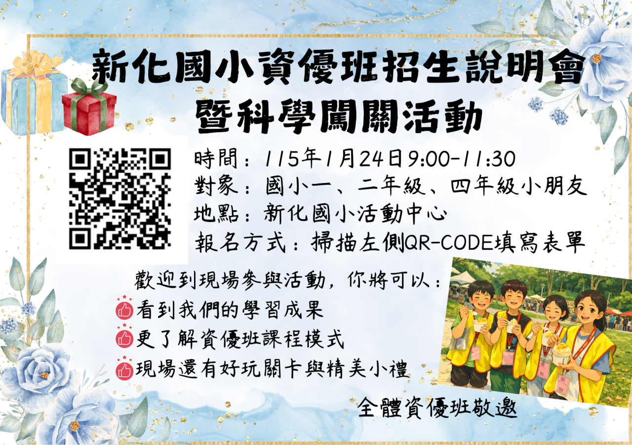 本校「資優班招生說明會暨創意闖關」歡迎設籍臺南市,一至四年級的學生踴躍參加!